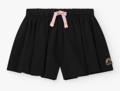 Short in maglia per bambina nera: Con vita elastica e fiocco decorativo rosa. Include un piccolo dettaglio ricamato di arcobaleno. Collezione First Have Fun.