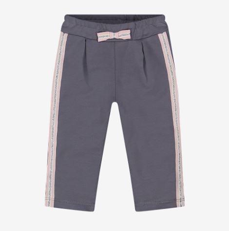 Pantalone lungo dal taglio dritto in morbida felpa di cotone stretch colore grigio scuro, fettuccia sui fianchi a contrasto colore rosa, bianco e argento lurex. Fiocco applicato e pratico elastico in vita. Capo ideale non solo per look basici ma anche per giornate di gioco.